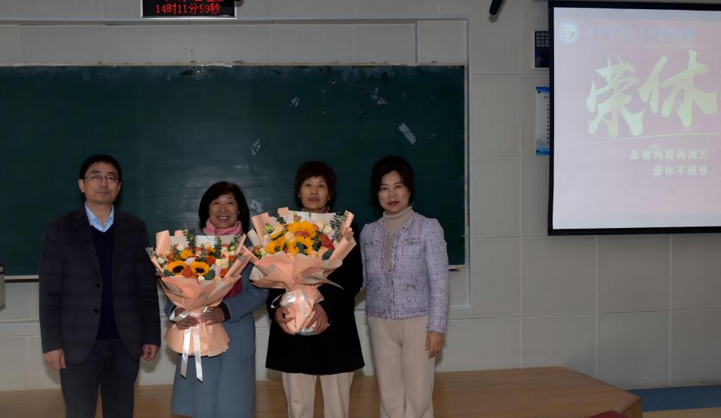 在B教201教室为程素菊、赵秀平等12位教师举行荣休仪式。学院全体教职工欢聚一堂,共同见证这一温暖而庄重的时刻。